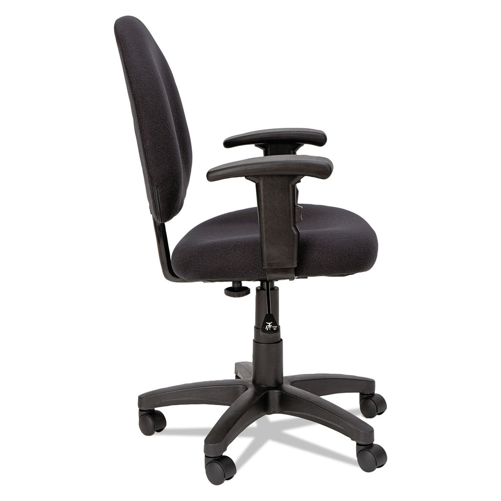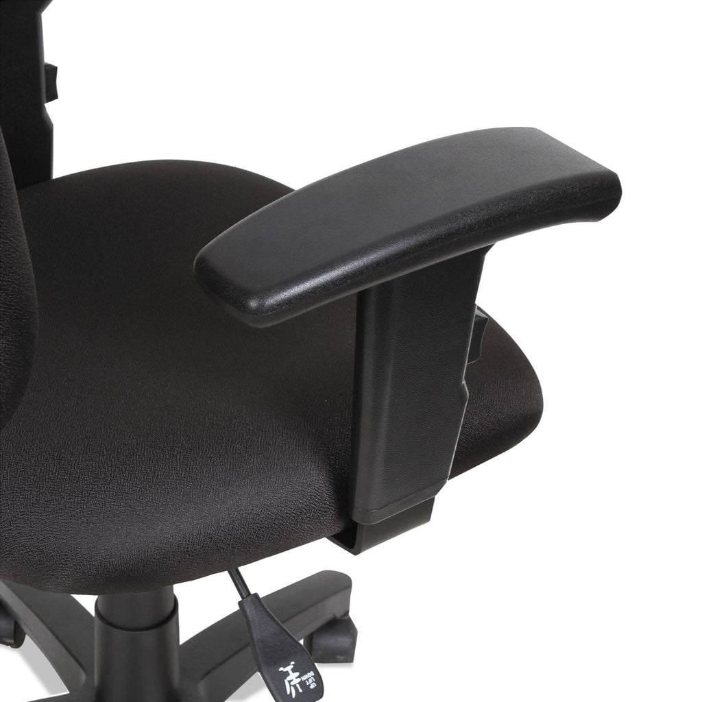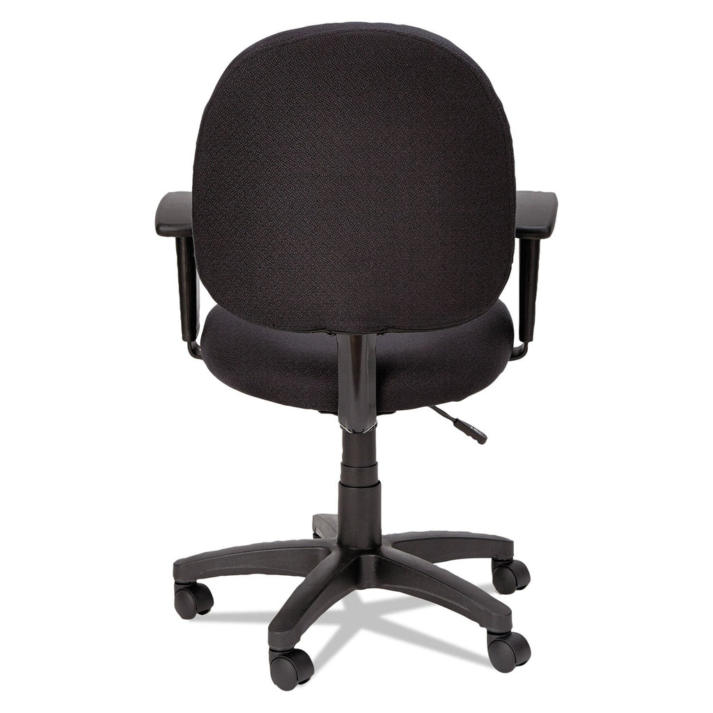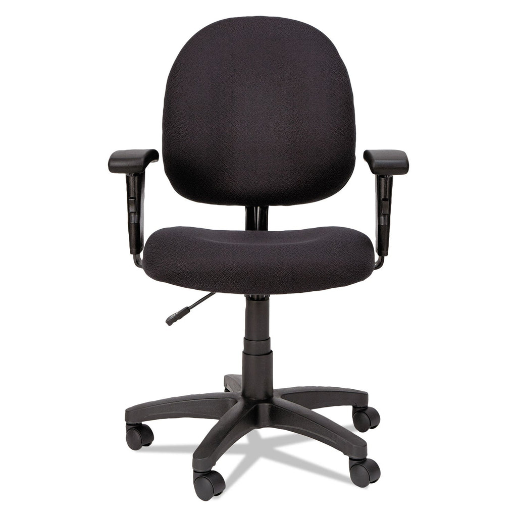 Contoured seat and back provide comfort for long hours of sitting. Height-adjustable arms for comfort and support. Seat height adjusts to accommodate different user's comfort levels. Features back depth adjustment and rotates a full 360° in either direction for ease of motion. Black five-star base with casters.