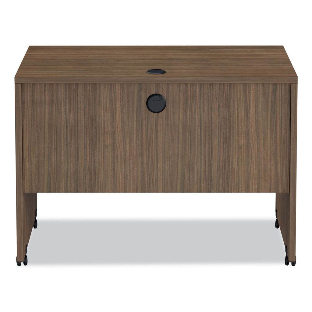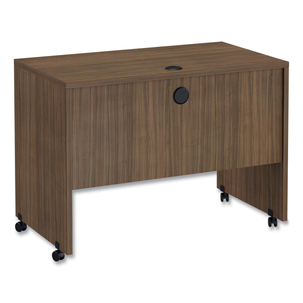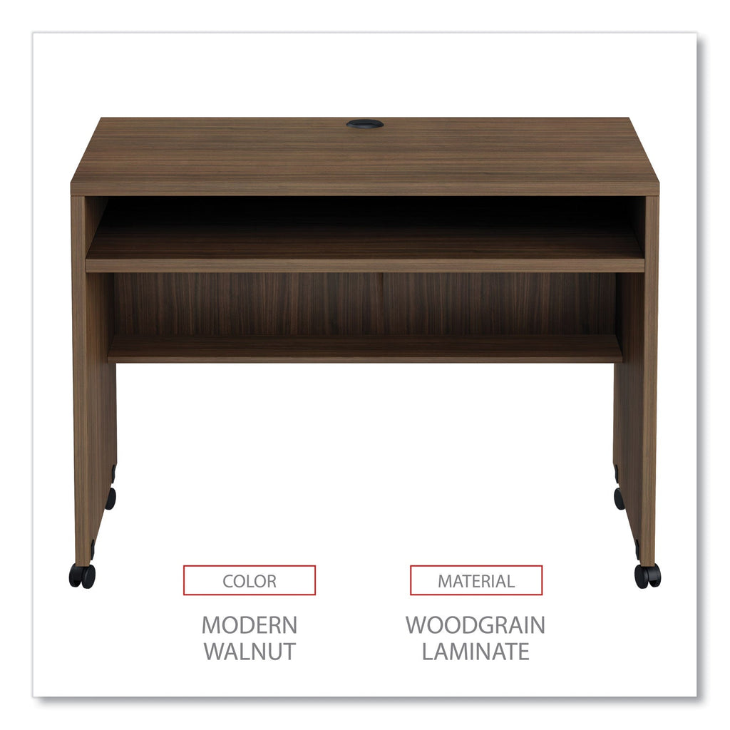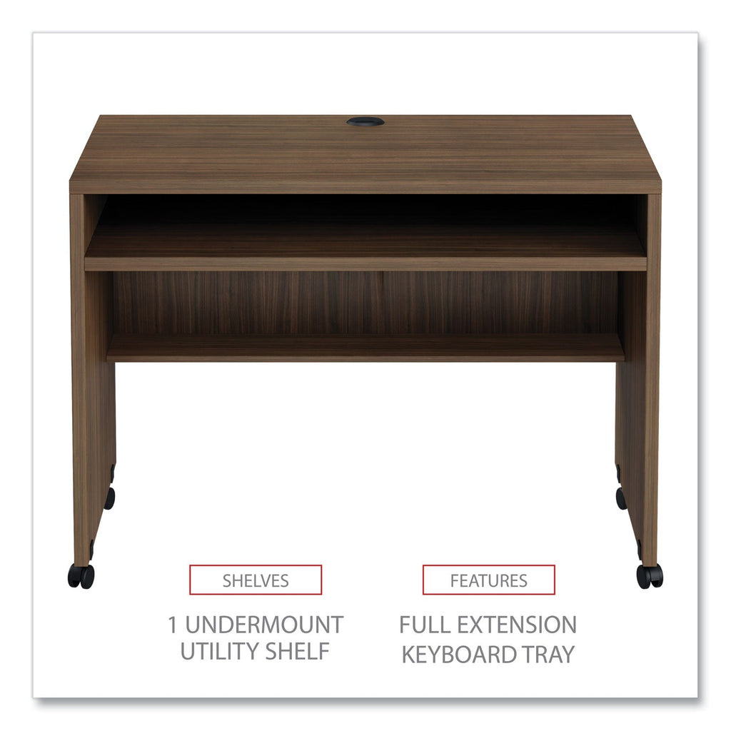 Portable mobile workstation desk goes anywhere you need it. Scaled to fit in tight spaces and designed to pass through standard doorways to go from room to room. Full width, full-extension, slide-out keyboard tray. Commercial-grade laminate worksurface and side panels are water, scratch, and dent-resistant. Protective edge banding helps prevent damage from bumps. Two grommets for cable and wire management. Undermount interior shelf for quick storage and to hold wires when moving. Three-fourths height back modesty panel for privacy. Four casters (two locking) for mobility.