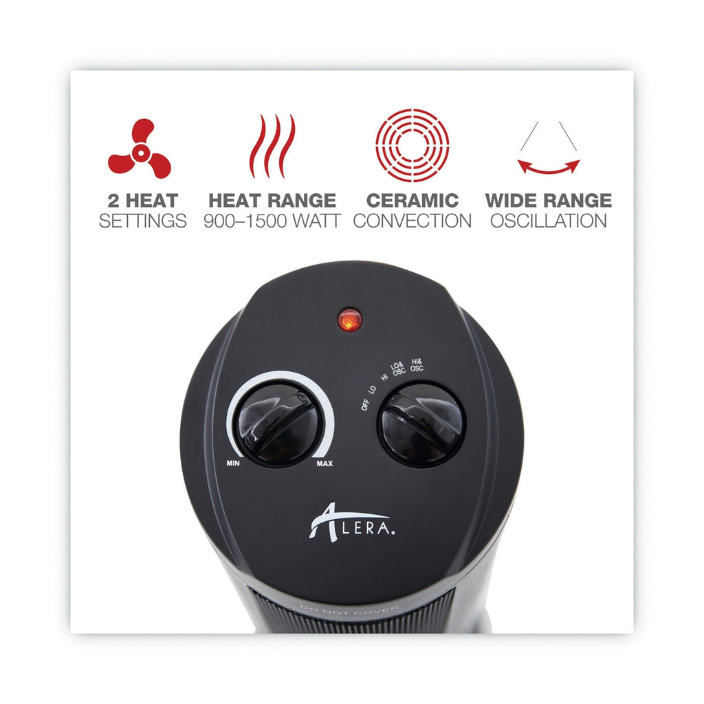The oscillating mini tower heater delivers heat where you need it. Air is warmed as it passes over a large ceramic and aluminum heating element, and heat is dispersed by a powerful fan. Adjustable thermostat up to 1500-watt heating output for maximum comfort. Designed with safety in mind with overheat auto-shut off protection, tip-over safety switch, and a cool-to-the-touch plastic housing.