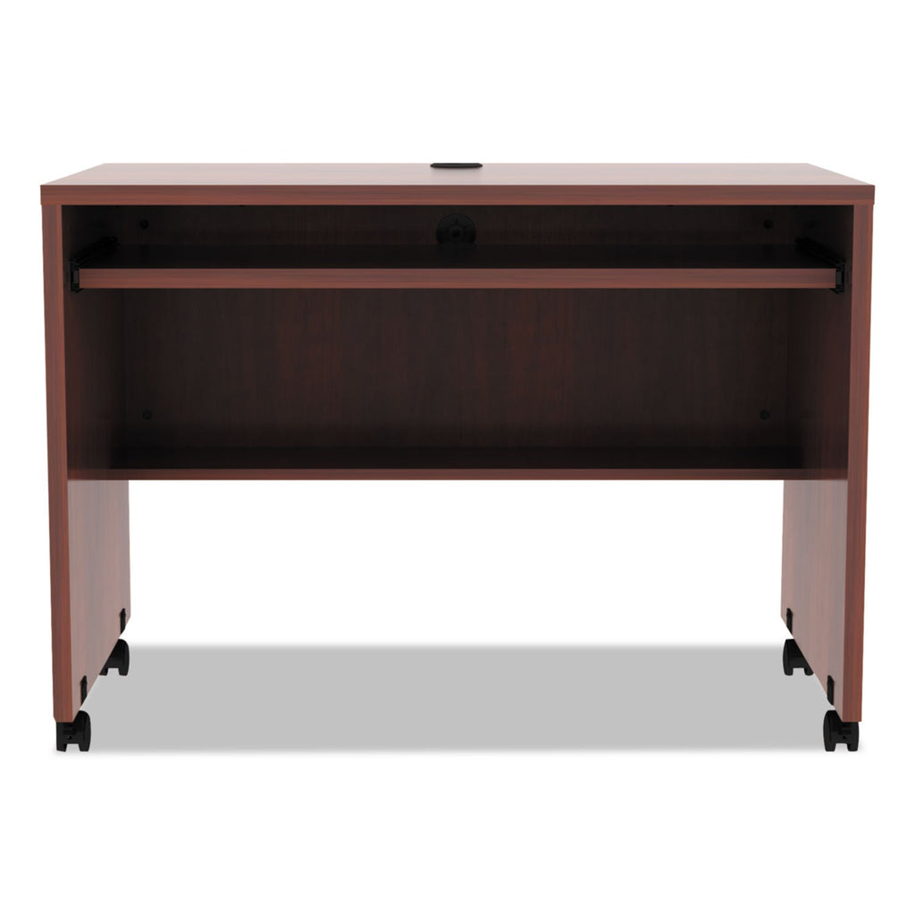 Portable mobile workstation desk goes anywhere you need it. Scaled to fit in tight spaces and designed to pass through standard doorways to go from room to room. Full width, full-extension, slide-out keyboard tray. Commercial-grade laminate worksurface and side panels are water, scratch, and dent-resistant. Protective edge banding helps prevent damage from bumps. Two grommets for cable and wire management. Undermount interior shelf for quick storage and to hold wires when moving. Three-fourths height back modesty panel for privacy. Four casters (two locking) for mobility.