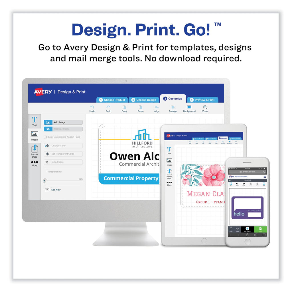 Choose from a variety of badge styles: "Hello", plain or border-style. Self-adhesive badges adhere firmly and remove easily. Removable adhesive is safe for most fabrics. Easy to customize with free templates from Avery® Design & Print. Handwrite or print 4" x 6" with a laser or inkjet printer.