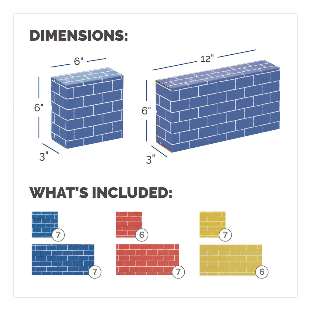 • Set includes blocks in two sizes (12" x 6" x 3" and 6" x 6" x 3") and three colors.