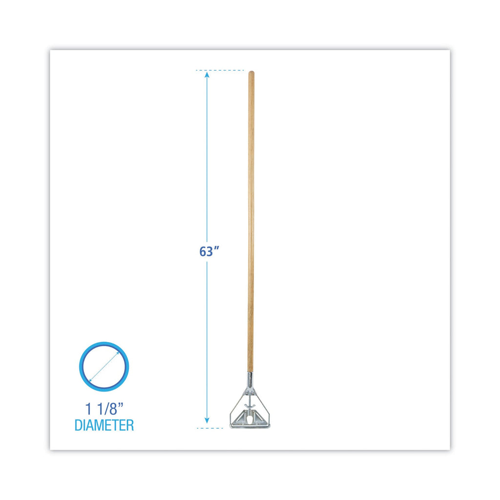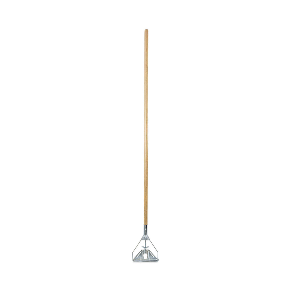 This quality wood mop handle is designed to be sturdy. The double-riveted metal clamp is securely fastened to the handle for extra strength. Made from solid wood and slightly lacquered for an easy, smooth finish that resists water and splintering. Wing-nut screw adjust to fit the size of the mop head, which is sold separately.