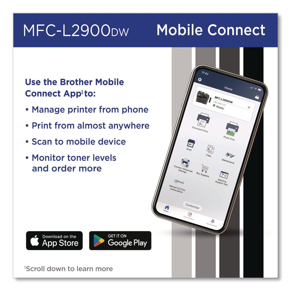 Designed for exceptional efficiency and premium performance, the MFC-L2900DW Wireless Compact Monochrome (Black & White) All-in-One Laser Printer is an affordable choice for business-grade printing, copying, scanning and faxing. Quick and efficient, it consistently produces crisp, easy-to-read black-and-white prints at speeds up to 36 pages per minute (ppm). Powerful time-saving features like single-pass duplex scanning and a 50-page automatic document feeder help you handle large multi-page double-sided copy, scan, and fax jobs with ease. Convenient automatic duplex printing and a 250-sheet paper tray reduce the frequency of paper refills. With an enhanced, highly efficient fuser design, this model offers a 22% reduction in electricity consumption compared to its predecessor. This also means a significantly shorter warmup time from sleep mode, so you can start printing in half the time. Navigation is simple and straightforward with the large integrated 3.5" touchscreen, which allows you to easily print-from and scan-to popular Cloud-based apps. Flexible connection options include dual-band wireless, Ethernet and USB 2.0. Advanced security features offer peace-of-mind to help safeguard information and maintain secure connections while printing. Streamlining four critical business functions into one compact footprint, this multi-function wireless printer is an efficient, time-saving addition to any workspace.