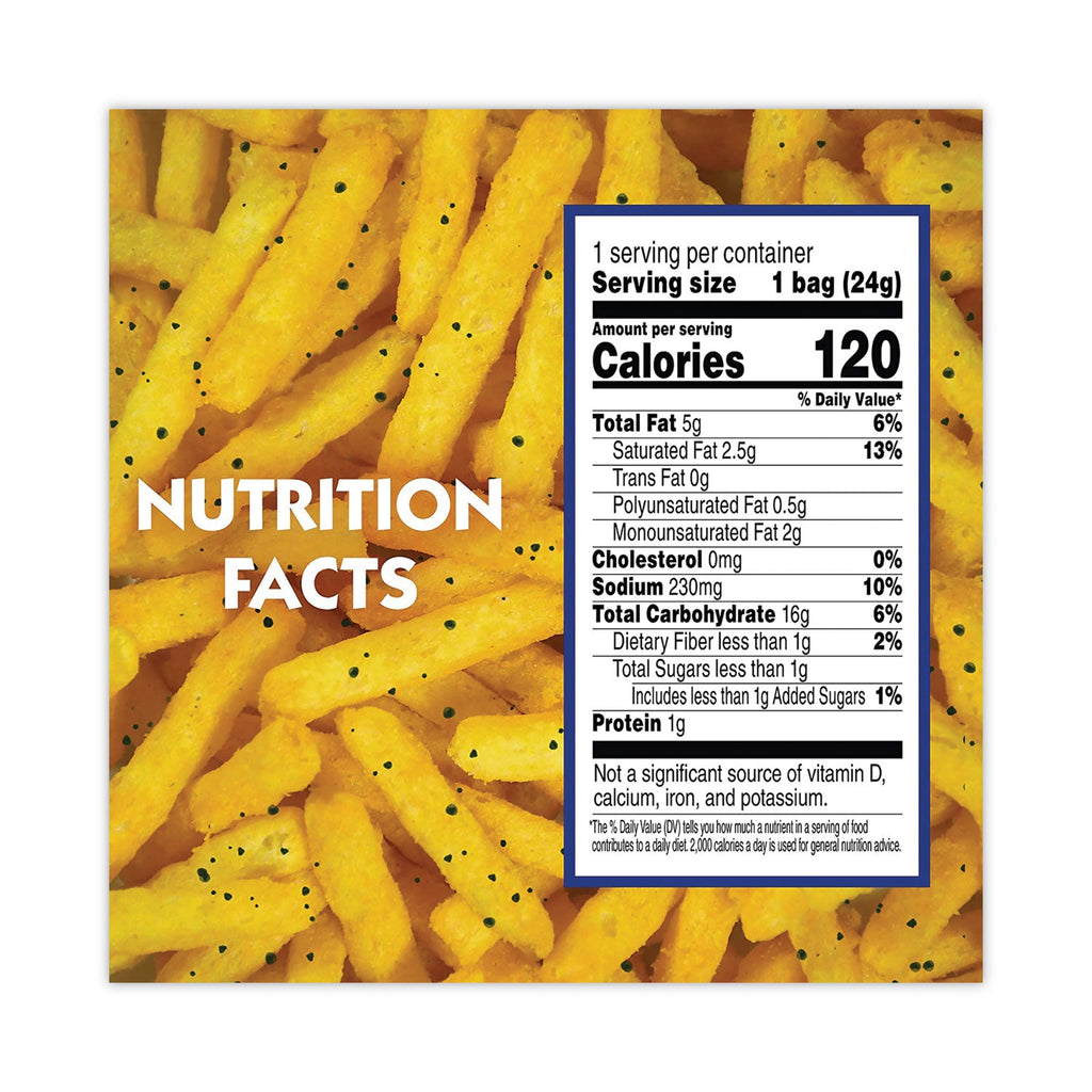 Why settle for plain old potato chips or dry pretzels? Reach for these cheddar fries, guaranteed to tantalize your taste buds and satisfy your hunger. Each crunchy corn and potato snack fry is bursting with rich cheddar cheese flavor. Who needs a dip, this snack is perfect on its own! Plus, with 72 individual bags, this is a perfect bulk pack to stock the pantry, use in grab bags, or to keep on hand for when hunger strikes. Add some variety to snack time.