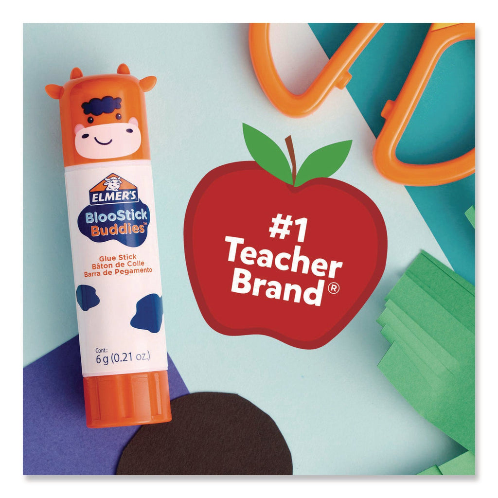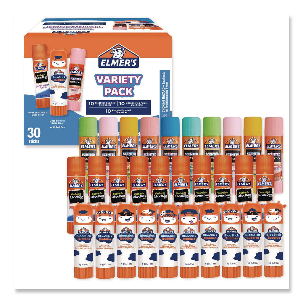 Inspire a burst of creativity in arts, crafts, or school projects with Elmer's Glue Sticks! This variety pack features three of the most beloved glue sticks in the classroom. First, you'll find the latest from Elmer's€”BlooStick Buddies! They feature special characters on each glue stick with anti-roll caps. You'll also receive Elmer's Scented Glue Sticks which delight your little learner's senses and ignite their imagination as they glue. Finally, you'll find disappearing purple glue sticks, which go on purple and dry clear, so kids know where they're applying adhesive. All Elmer's glue sticks in this pack are safe, washable, and nontoxic, perfect for school or home.