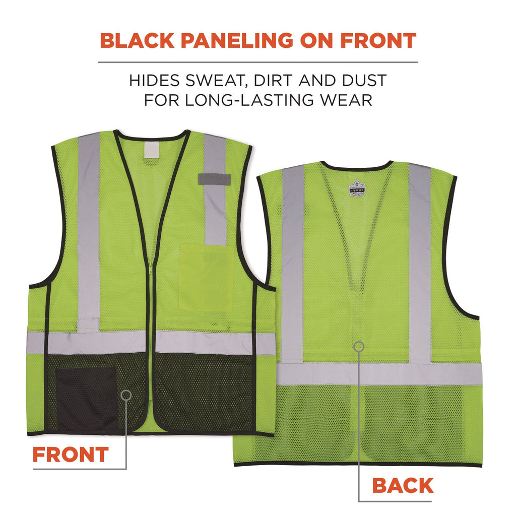 This hi-vis Class 2 mesh safety vest is made of 100% polyester mesh with a black panel across the bottom front to hide dirt, grit and dust to keep the vest looking cleaner longer. This vest features 2" reflective tape for enhanced low-light visibility, plus a lower interior pocket, upper exterior pocket and single mic tab. A zipper closure makes for easy on and off. This vest is available in dual sizes and is designed for a looser fit for wear over shirts, sweatshirts or jackets. This reflective safety vest is ideal for anyone requiring Type R, Class 2 apparel, including road construction, baggage handling and municipalities.