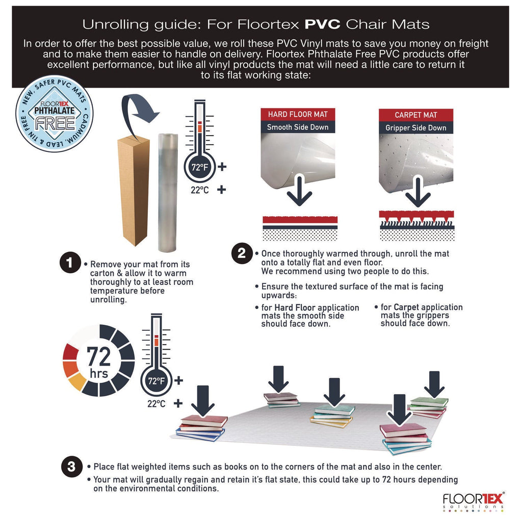 - Clear floor protection mat is made from a unique PVC formulation to provide optimum vinyl performance and durability; prevents damage and wear to carpeted floors often caused by chair casters and footwear.