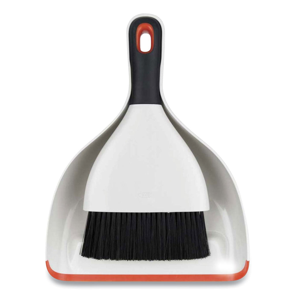 Cleaning up is a breeze. The set features soft, comfortable egg-shaped handles and a whisk-broom shaped brush for easy sweeping. The brush nests perfectly in the dust pan for convenient storage. A pair of teeth located on the top edges of the pan allow you to clean dust from the broom.