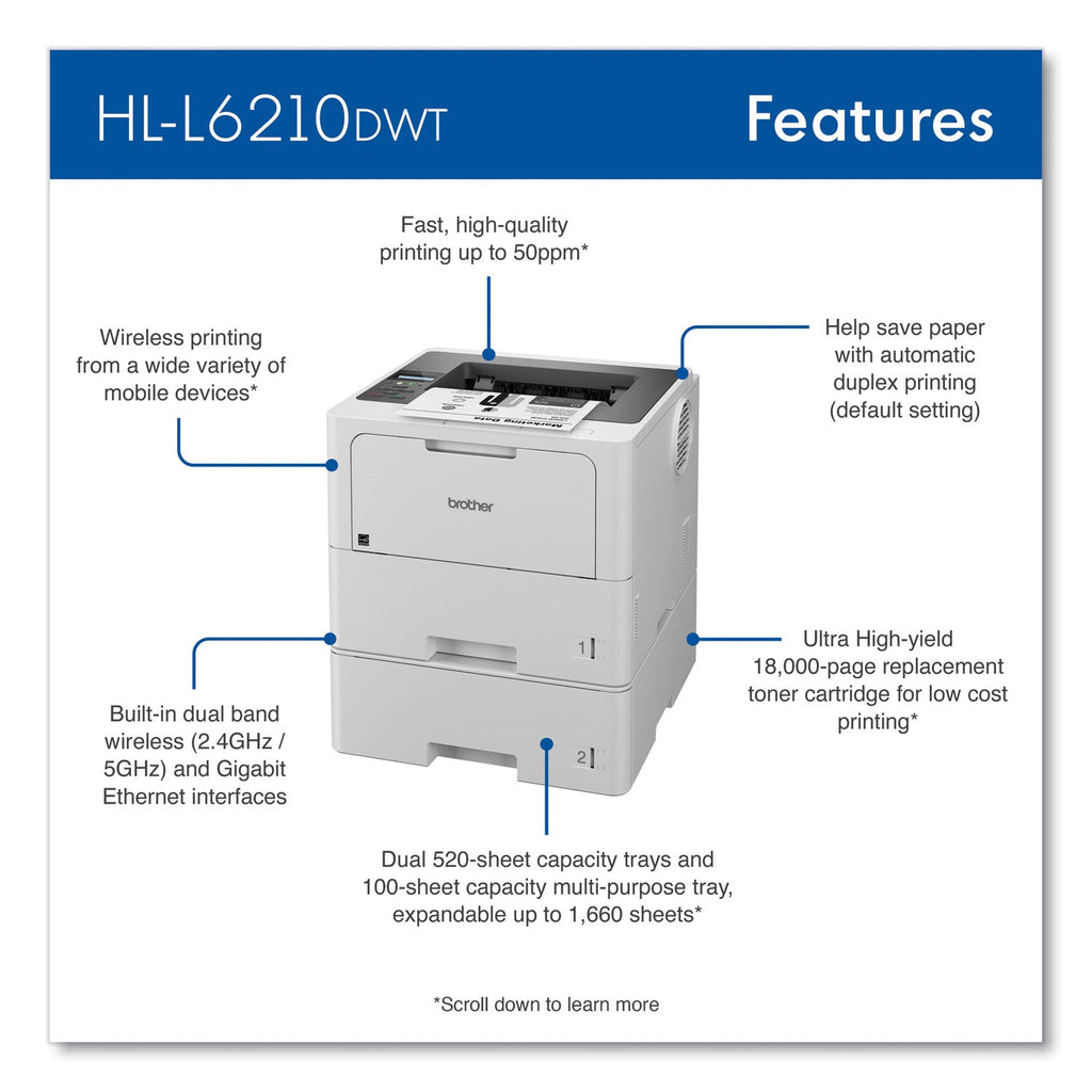 This monochrome laser printer is a great choice for busy offices and workgroups with higher print volumes that need fast, high-quality output, low-cost printing, large paper capacity and advanced security features. This high-performance printer helps to increase productivity with a fast print speed of up to 50 ppm. Reduce paper refills with dual 520-sheet capacity paper trays. Offers a large, expandable paper capacity that is scalable as your business needs grow. Delivers low-cost printing by using the TN920UXXL Brother Genuine ultra-high-yield replacement toner cartridge. Triple Layer Security features help to limit document and device access and protect against network intrusions. It also provides flexible connectivity with built-in Gigabit Ethernet and dual band wireless networking, plus convenient mobile device printing to meet mobile workforce demands.