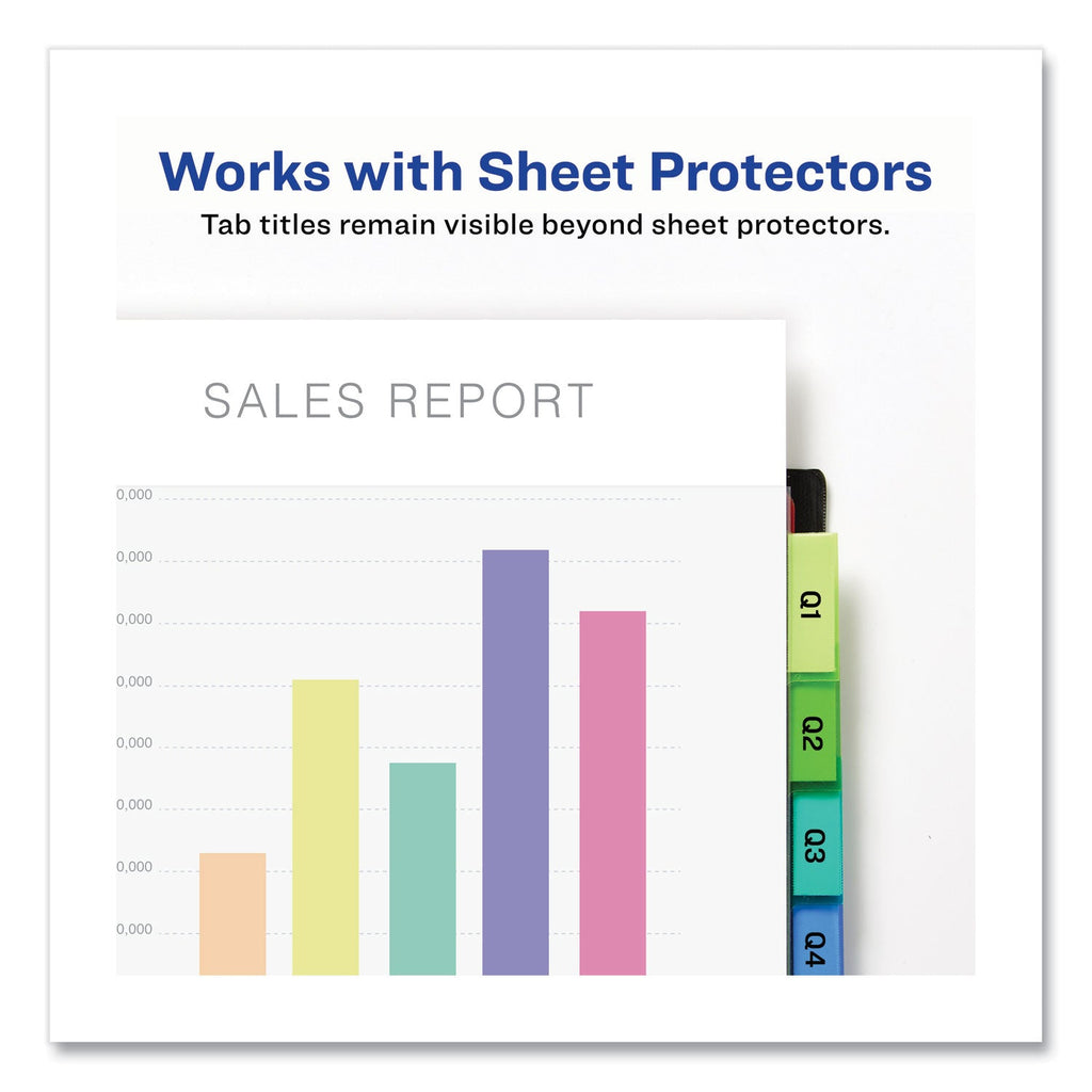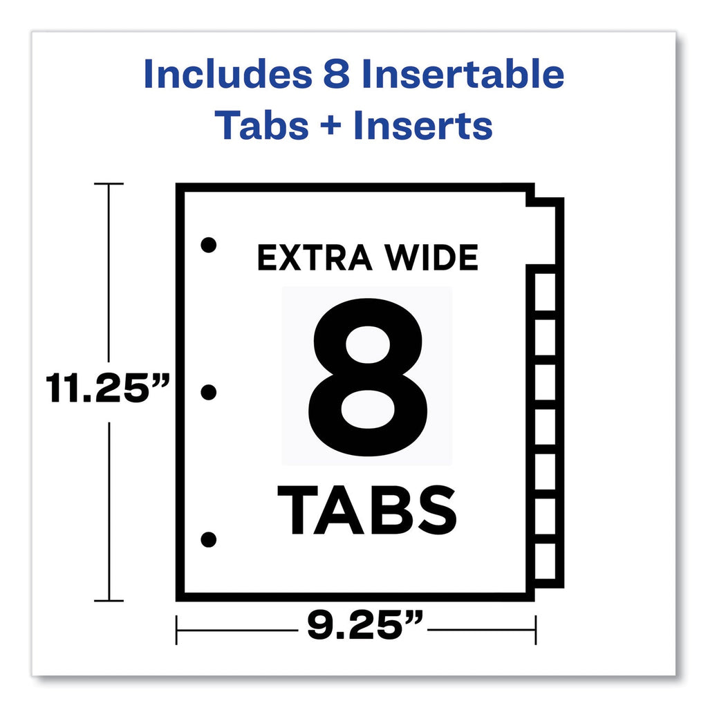Tabs provide 50% more writing space than standard tabs. Easily insert and remove tab titles. Pockets provide extra storage. Durable plastic allows for frequent reference. Easy to customize with free templates from Avery Design & Print. Handwrite or print inserts on laser and inkjet printers.