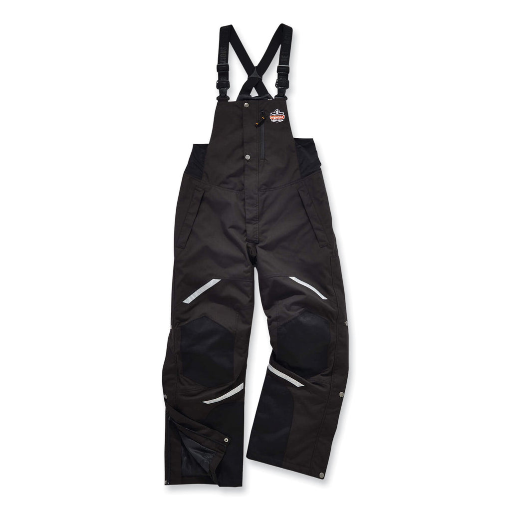 Heavy-duty insulated bib overalls are designed to be worn over work pants for warmth and durability in extremely cold environments. The 500D polyester oxford with breathable water-repellent coating protects from the elements, while 3M Thinsulate insulation traps heat for enhanced warmth. These black winter work bibs hide dirt and feature 1600D reinforcements to hold up through the toughest work conditions. For convenient storage, these work bibs have one chest pocket and two side pockets. Zippers on each leg make it easy to pull on and take off the insulated bib overalls without removing work boots. 4-way stretch sides enhance comfort where you need it, and adjustable elastic straps make for a custom fit. 3M reflective accents keep wearers safe and seen. These winter work bibs are a great choice for warmth while resisting heavy wear and tear in industries such as mining, construction and manufacturing.