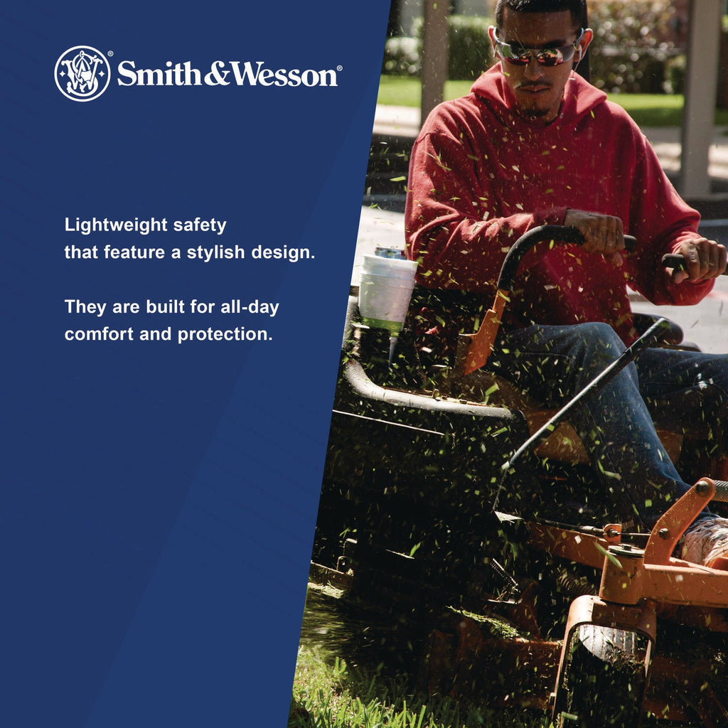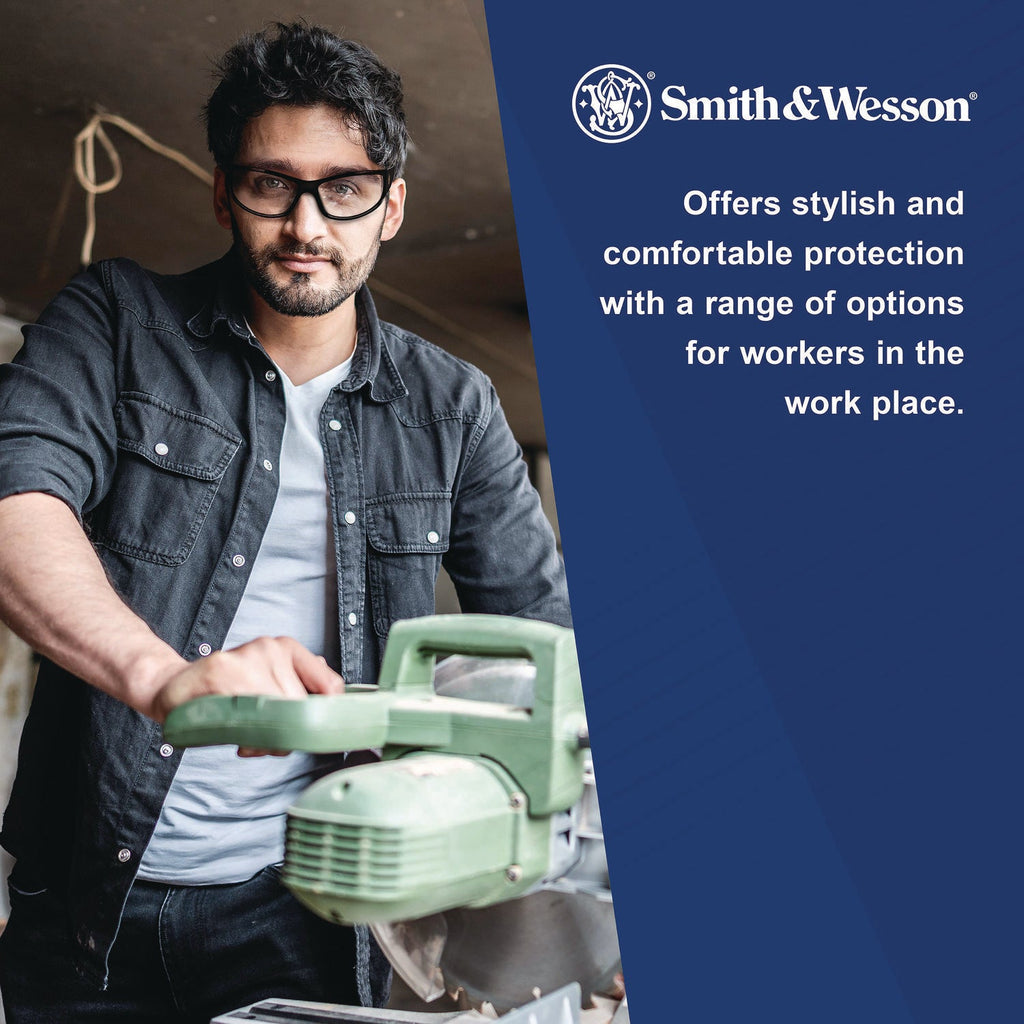 Do you need safety glasses that are designed to transition seamlessly from work to recreation? Smith & Wesson® 44 Magnum Safety Glasses provide all-day comfort and protection, in comfort and style. The minimal black frames hold clear one-piece lenses, for maximum visible light transmission. The safety glasses have a 4c x 7c base curve, which gives you the benefit of the lens hugging your face both side-to-side and up-and-down. They are also scratch-resistant and feature an anti-fog coating for use in humid environments. They are built for comfort, with soft touch rubber temples that contour around the head, a flexible nose piece that conforms to various nose shapes, and air vents on the temples to maximize air flow. These glasses provide 99.9% UVA/UVB/UVC protection and meet both ANSI Z87.1+ standards for high impact. No matter where you're using them, Smith & Wesson® Caliber Safety Glasses help deliver the comfort and protection you need.