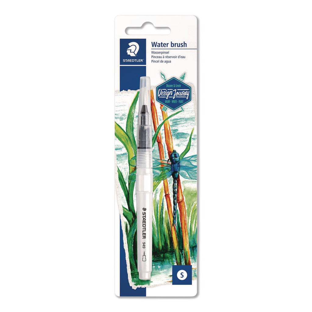 Water brush with round fine tip for watercoloring and painting. The easy-to-squeeze barrel and valve system allow for controlled flow of water.