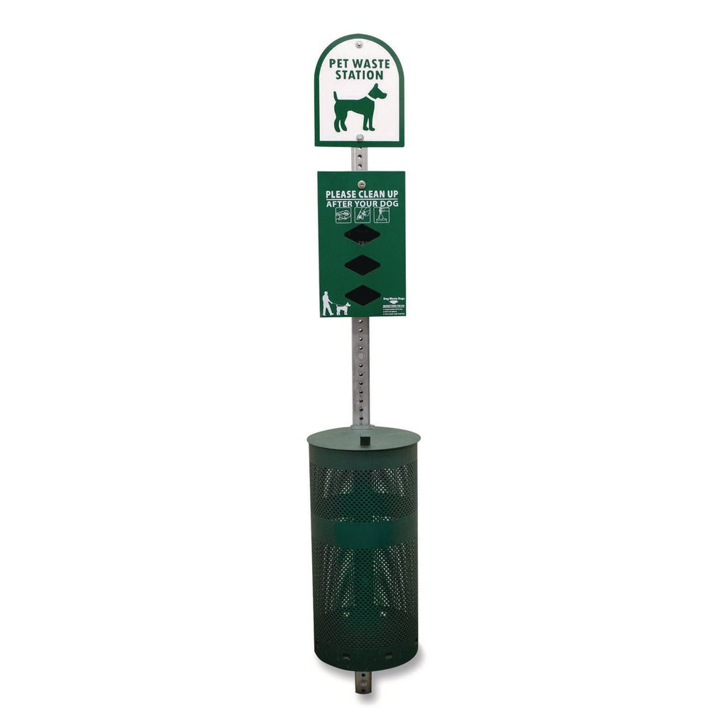 Helps keep parks, hiking trails, residential complexes, office landscapes, schools and recreation areas free from dog waste. Unit includes trash can, pet waste bag dispenser, and pet sign built from tough, rustproof, powder-coated aluminum along with a galvanized steel post. Three slot dispenser holds 800 Tatco 28600 Dog Waste Bags (sold separately). Hinged lid trash can for quick disposal. Low maintenance for busy environments. Simple assembly.