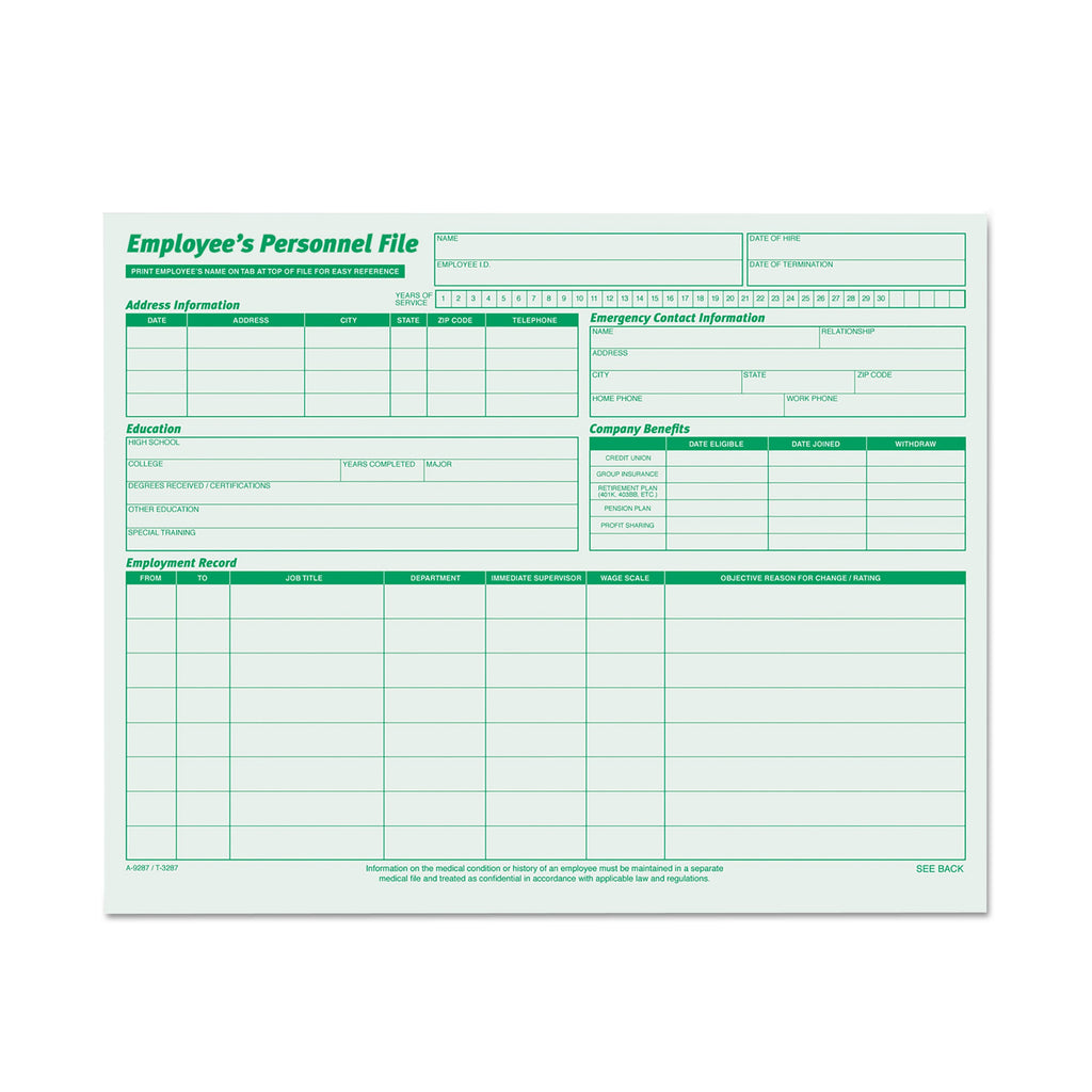 Update employee history and status on front. Record post-hire information on the back. Open sides; can be inverted for confidentiality. Index stock.