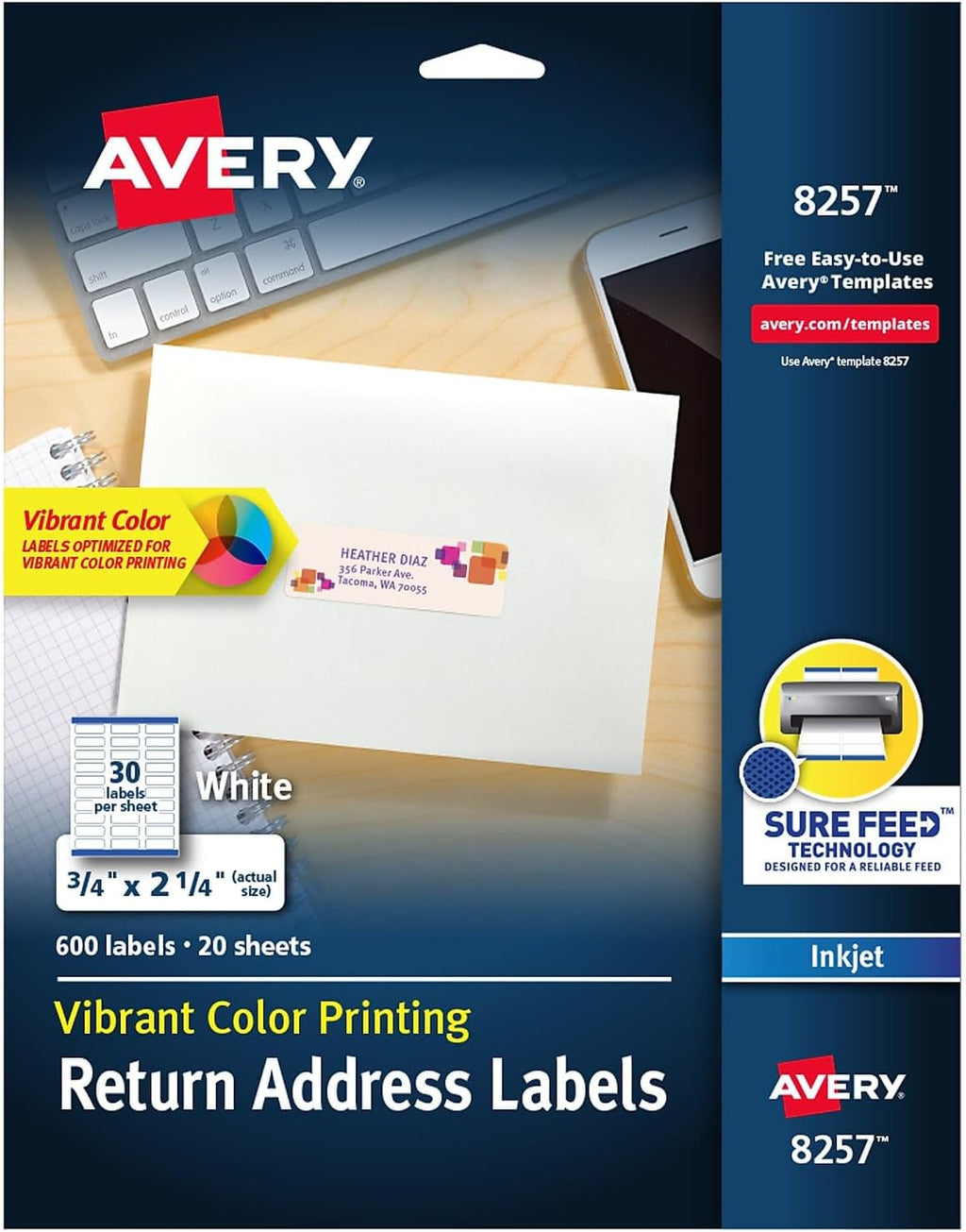Avery® Vibrant Color Printing Mailing Labels, Inkjet Printers, 0.75 X 2.25, Matte White, 30/sheet, 20 Sheets/pack