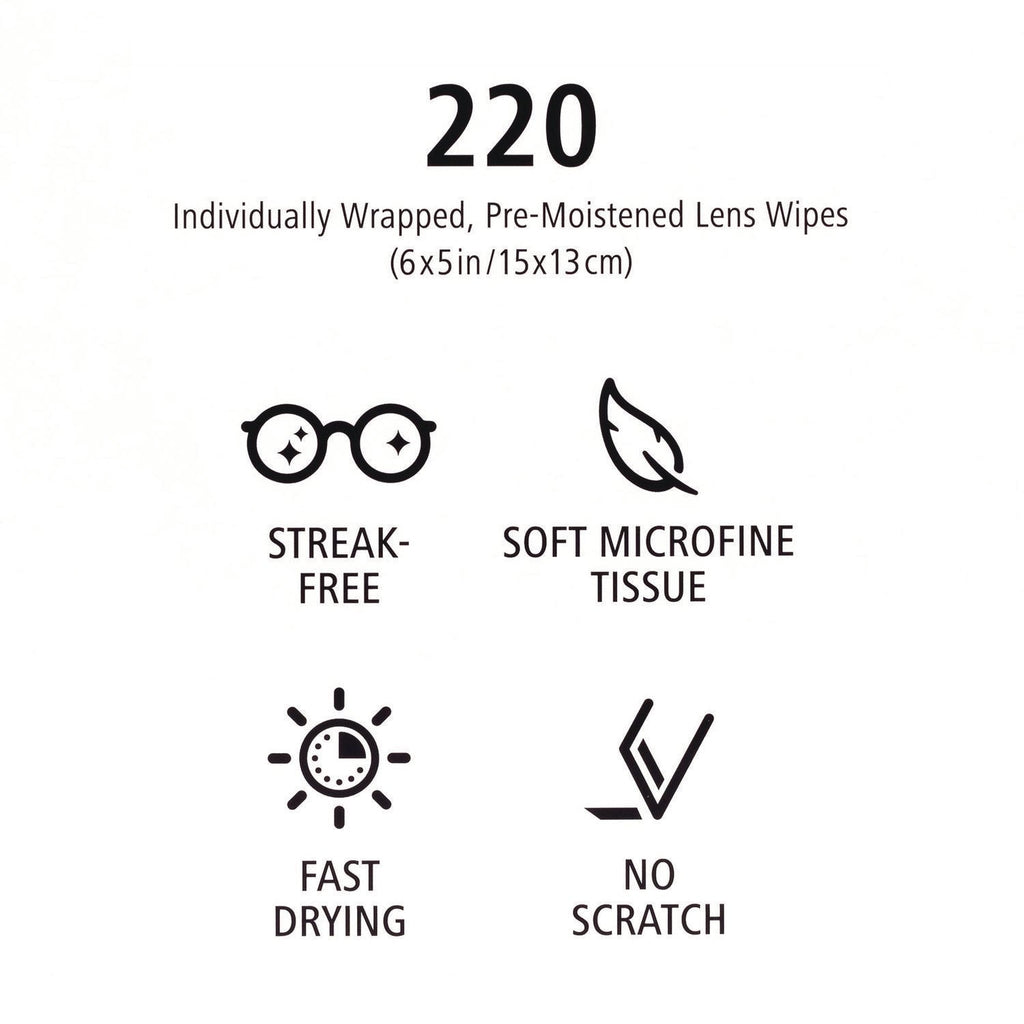 ZEISS pre-moistened lens wipes provide a gentle, thorough cleaning, removing fingerprints, dust, and smudges without scratching or streaks. Individually wrapped and disposable lens cleaning wipes can be conveniently stored anywhere, so you can safely clean your glasses while you're on-the-go. ZEISS Lens Wipes easily remove smudges and dirt leaving your glasses as clean as the first day you got them.